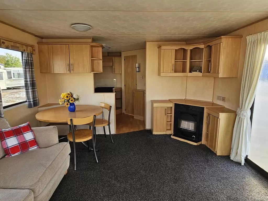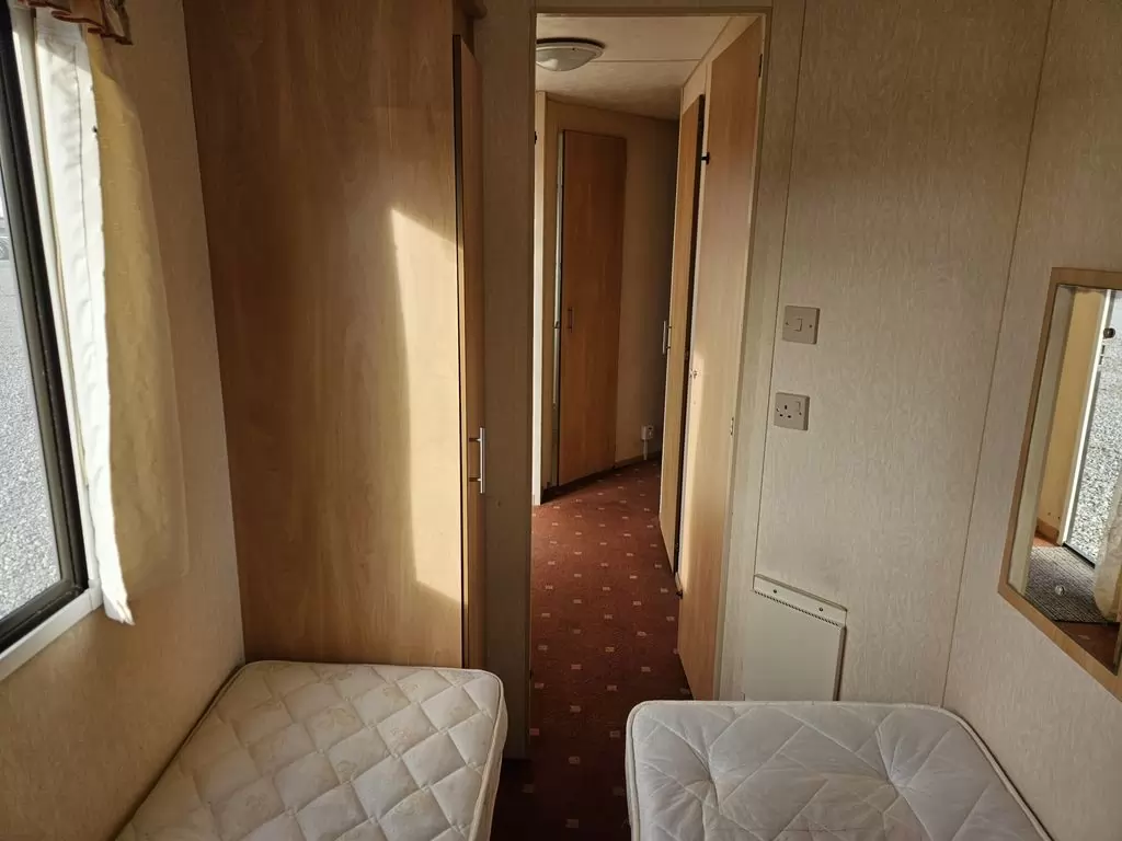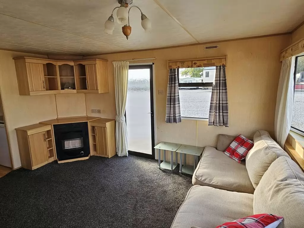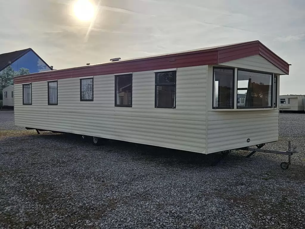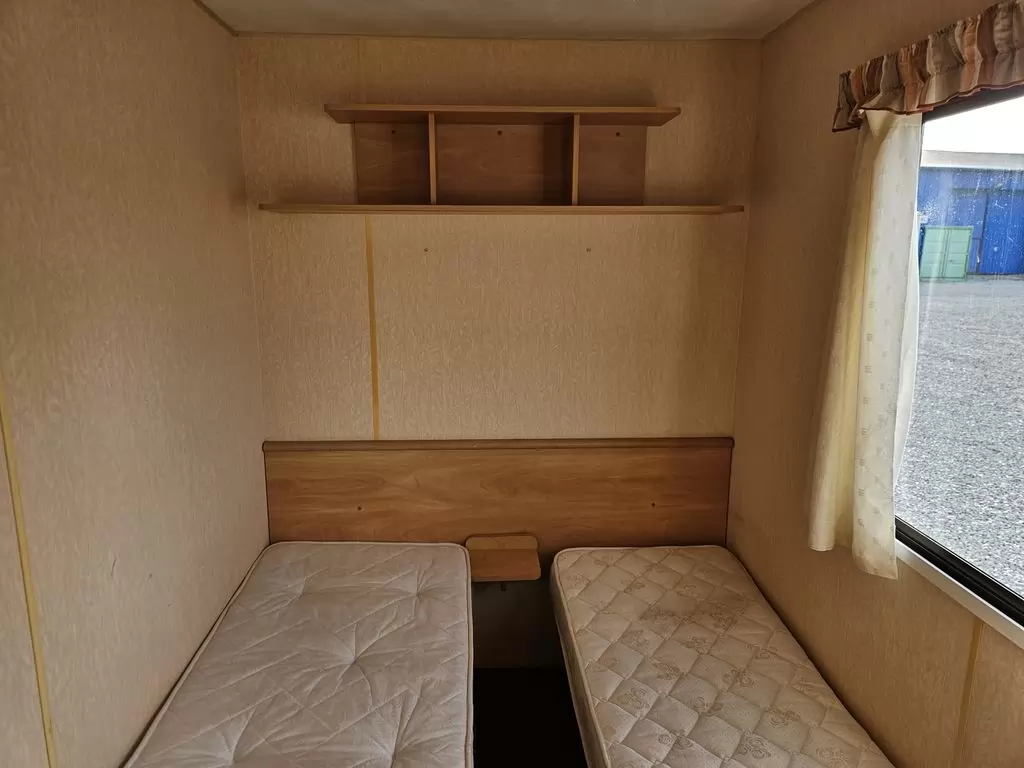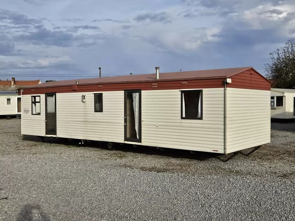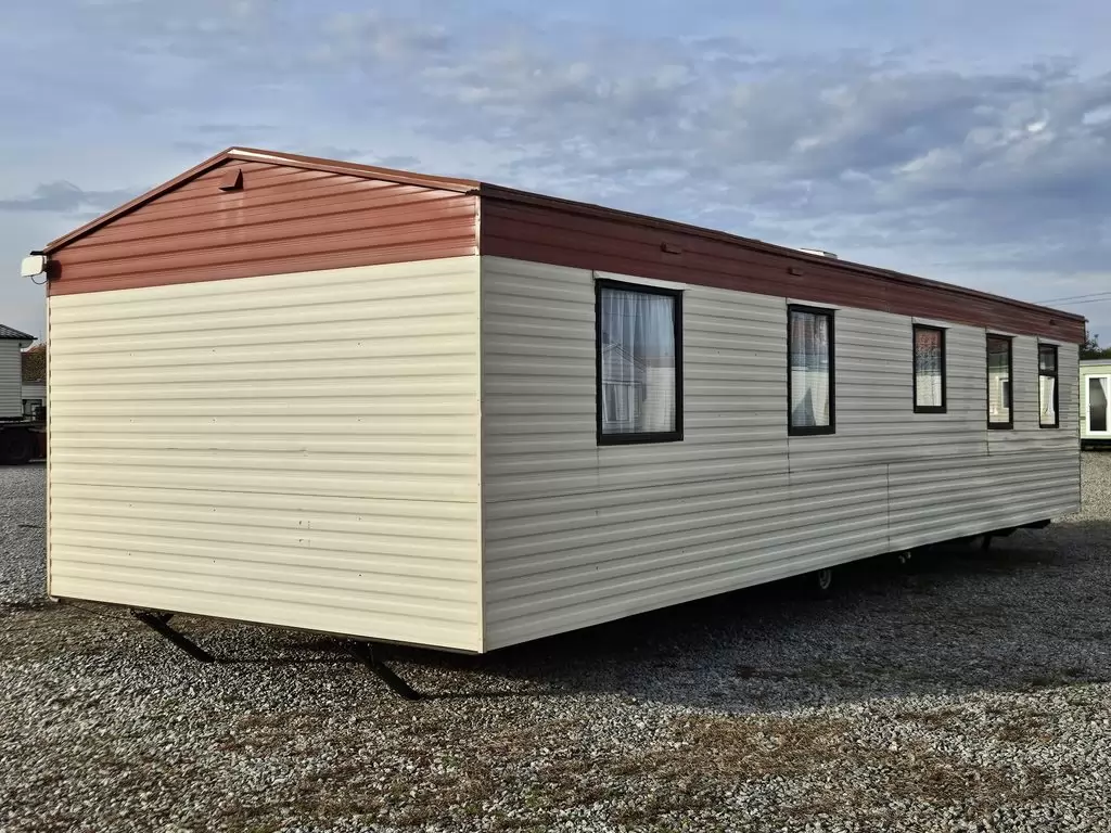 Extra široký, hezký, kompletně vybavený mobilheim 11,1 x 3,7m se dvěma vchody, SEDLOVOU STŘECHOU, DVOJITÝMI (izolačními) OKNY A DVEŘMI - dithermy. Prostorný obývací pokoj, jídelní kout, kuchyň ve tvaru U včetně spotřebičů, ložnice ( dvoulůžko ), pokoj ( 2 lůžka ), pokoj ( 2 lůžka ), koupelna se sprchovým koutem s pevnou zástěnou + wc. Plynový krb + el. přímotopy v pokojích, plynová karma na ohřev vody. Zvýšený strop v celém mobilheimu ! Mobilheim je po kuřákovi.