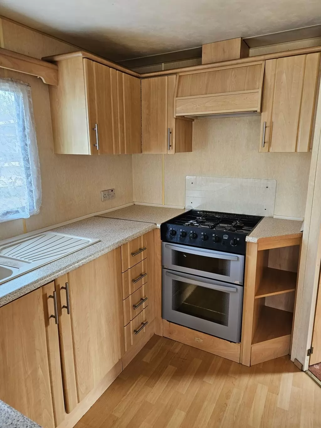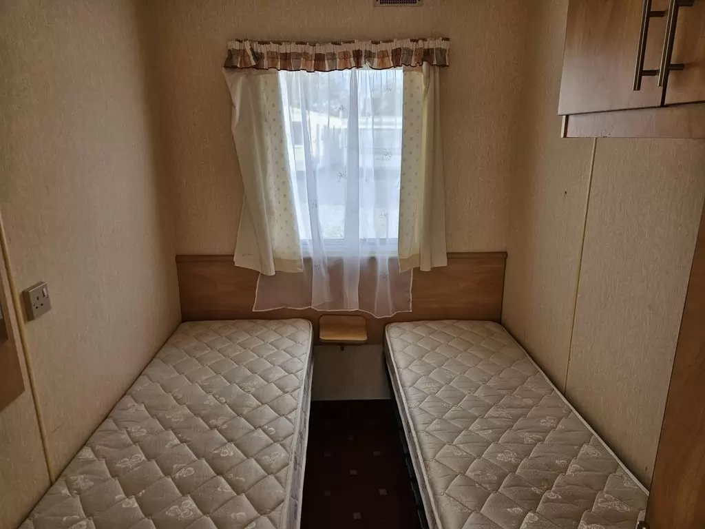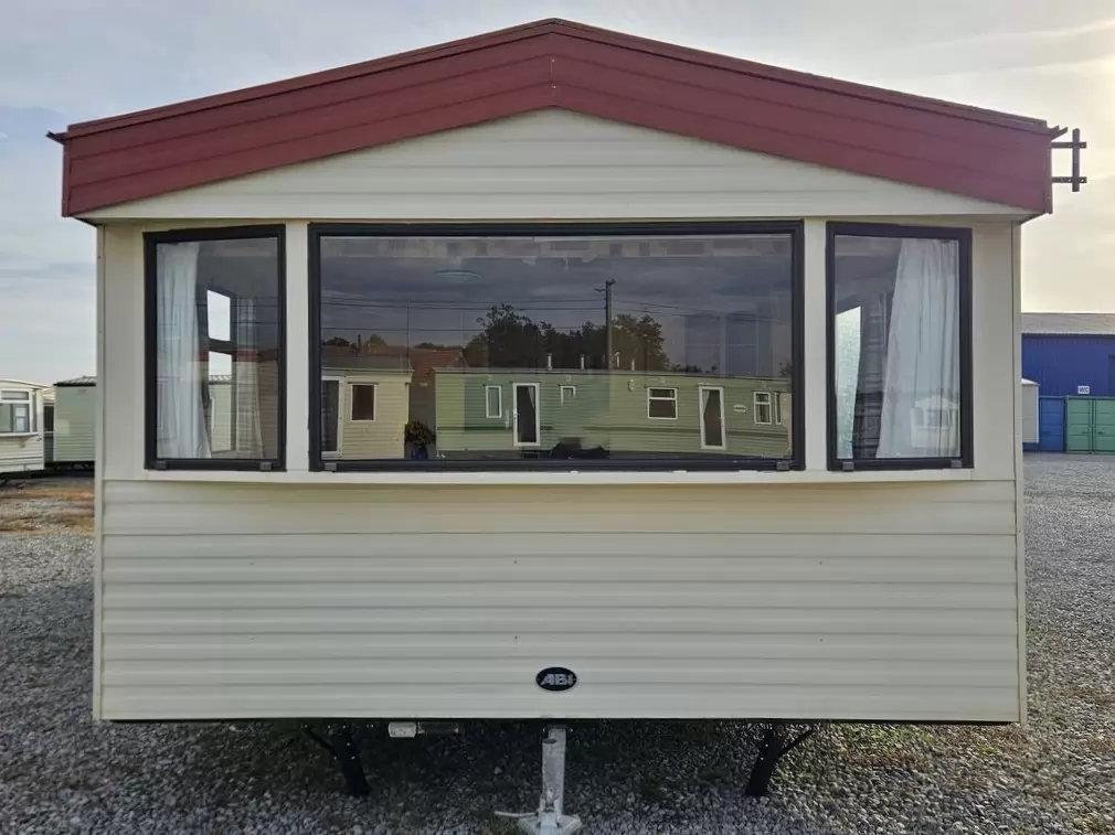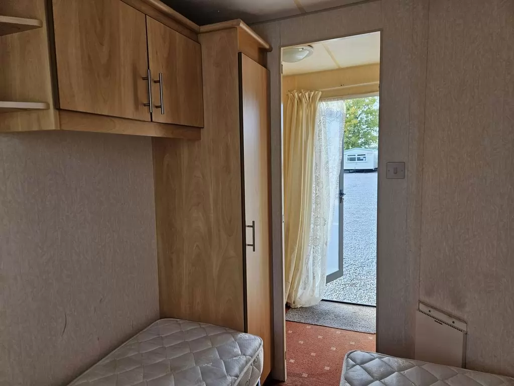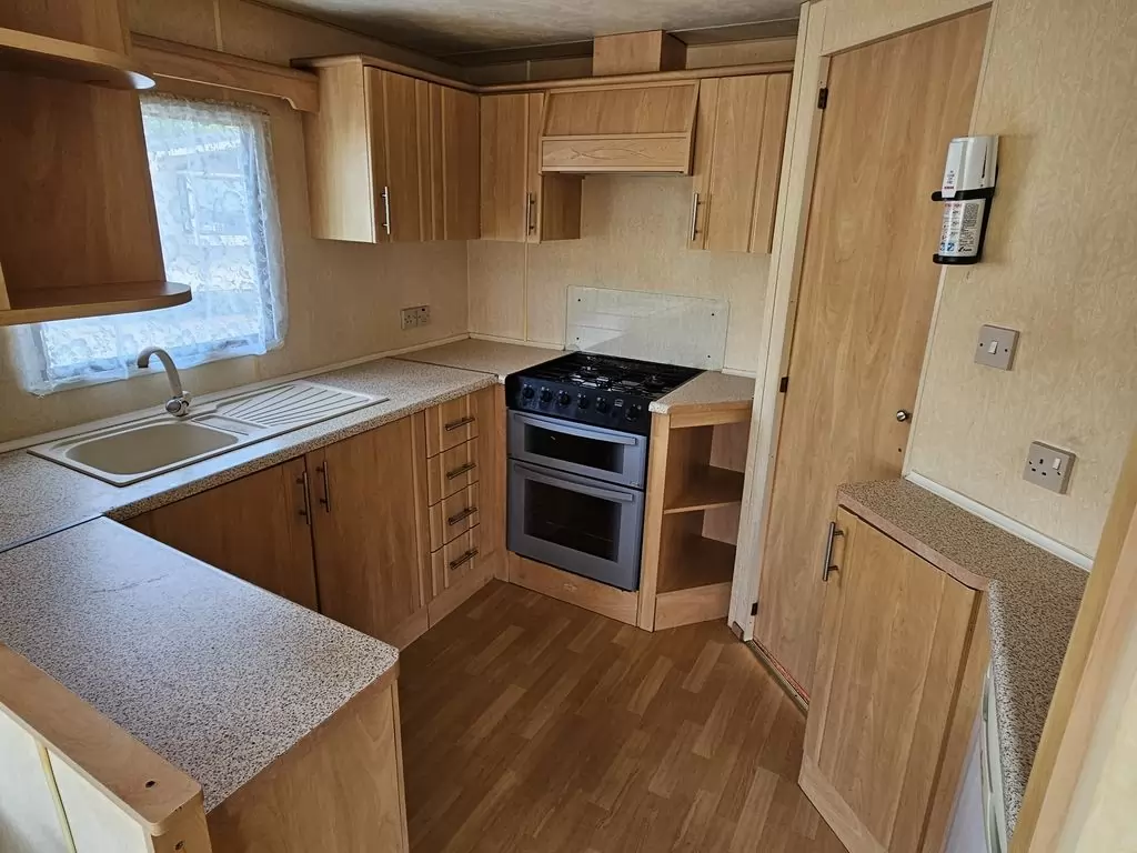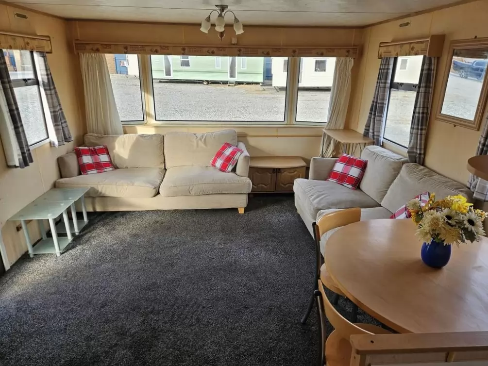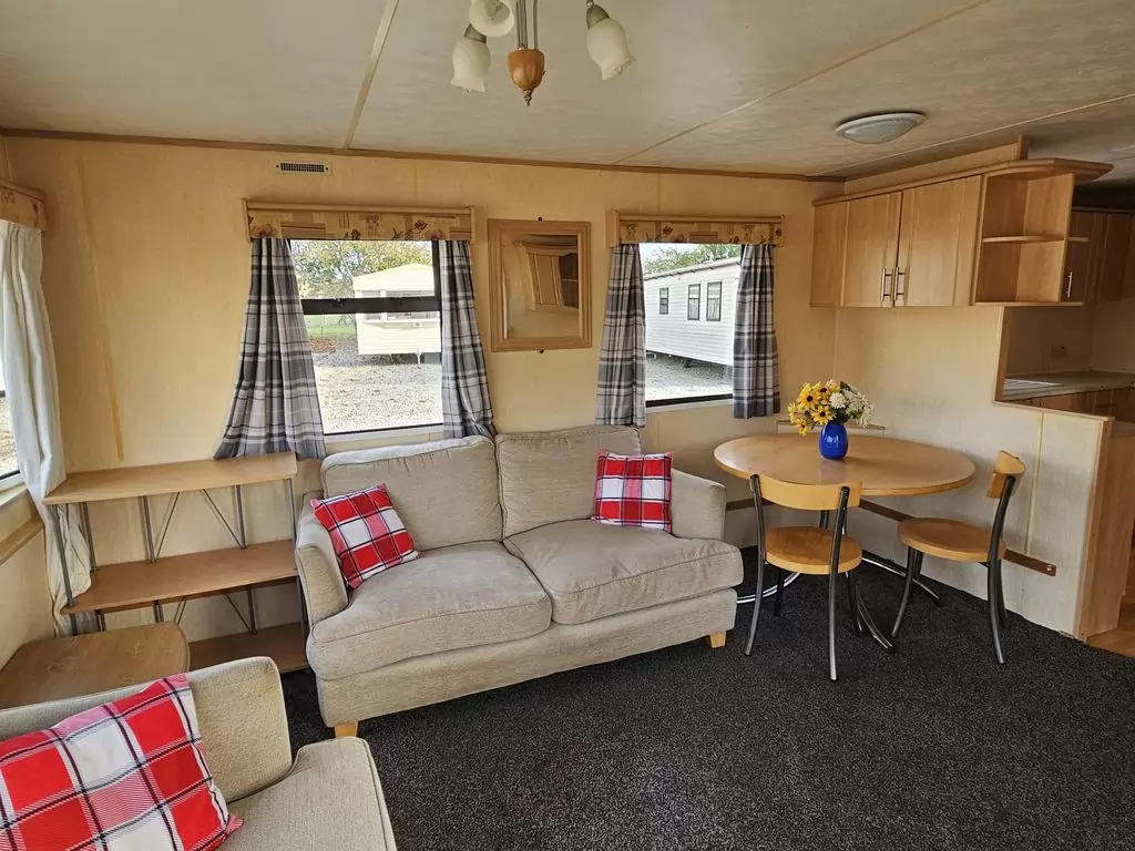 Extra široký, hezký, kompletně vybavený mobilheim 11,1 x 3,7m se dvěma vchody, SEDLOVOU STŘECHOU, DVOJITÝMI (izolačními) OKNY A DVEŘMI - dithermy. Prostorný obývací pokoj, jídelní kout, kuchyň ve tvaru U včetně spotřebičů, ložnice ( dvoulůžko ), pokoj ( 2 lůžka ), pokoj ( 2 lůžka ), koupelna se sprchovým koutem s pevnou zástěnou + wc. Plynový krb + el. přímotopy v pokojích, plynová karma na ohřev vody. Zvýšený strop v celém mobilheimu ! Mobilheim je po kuřákovi.
