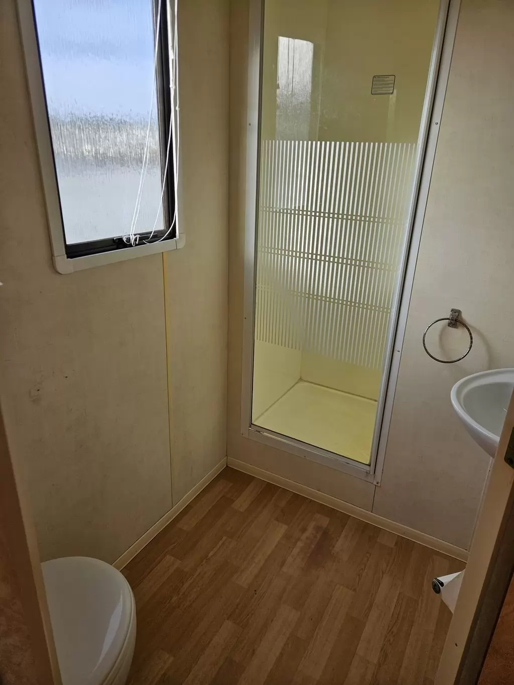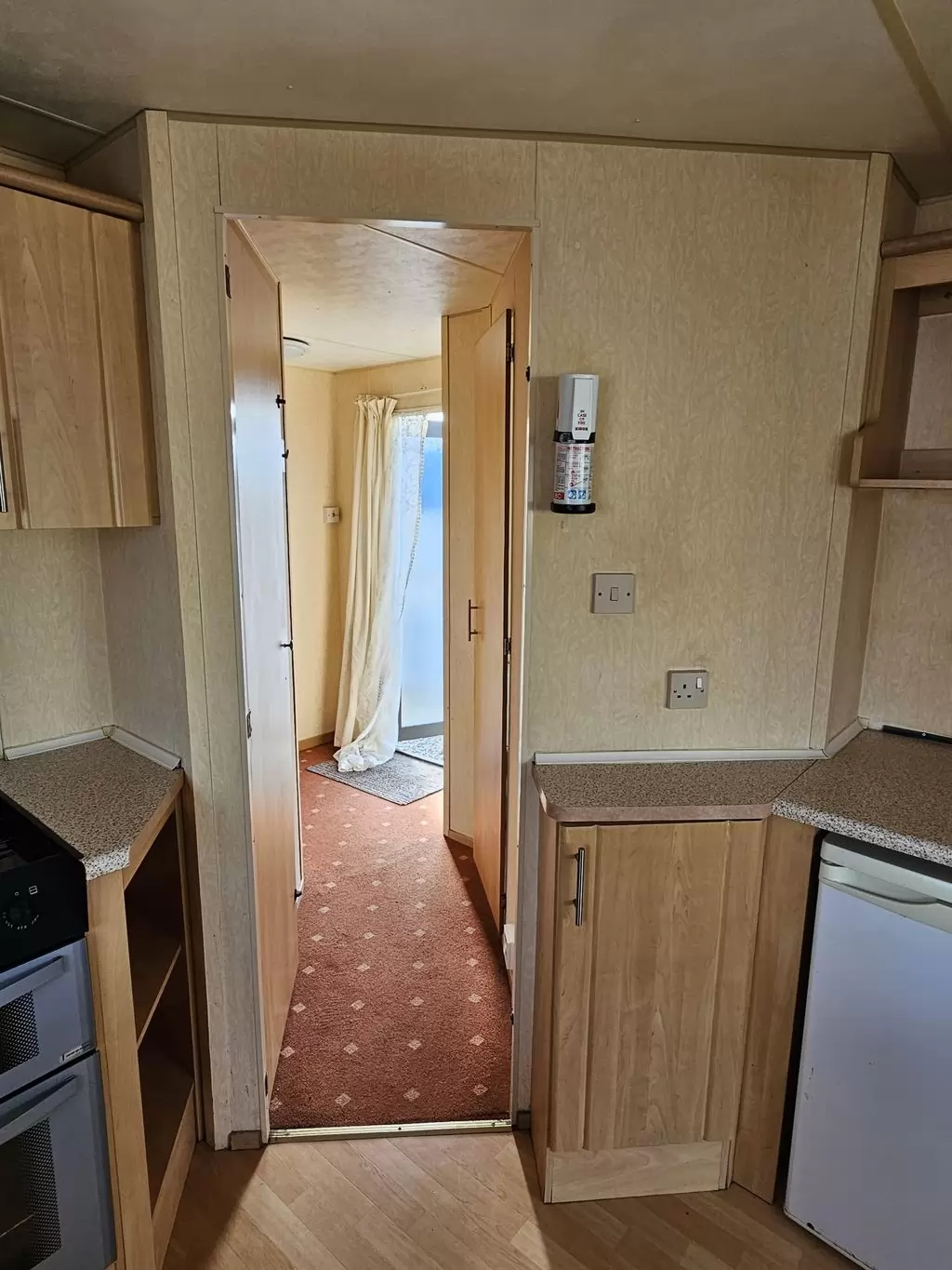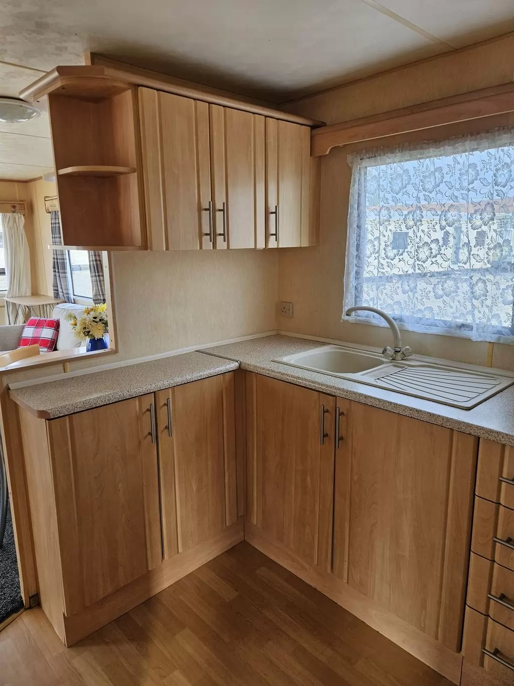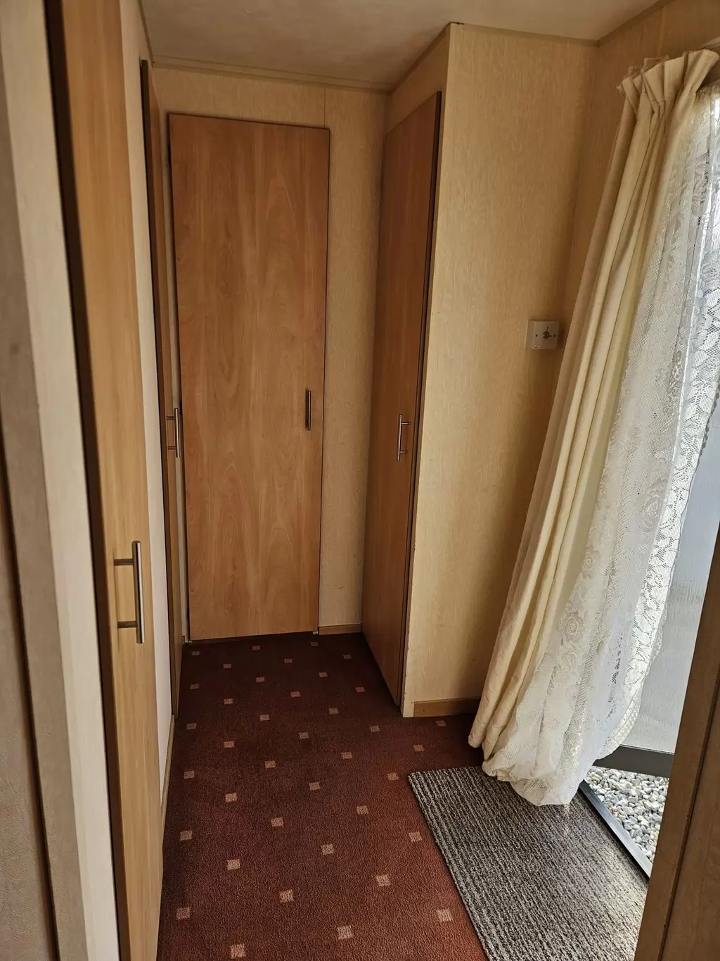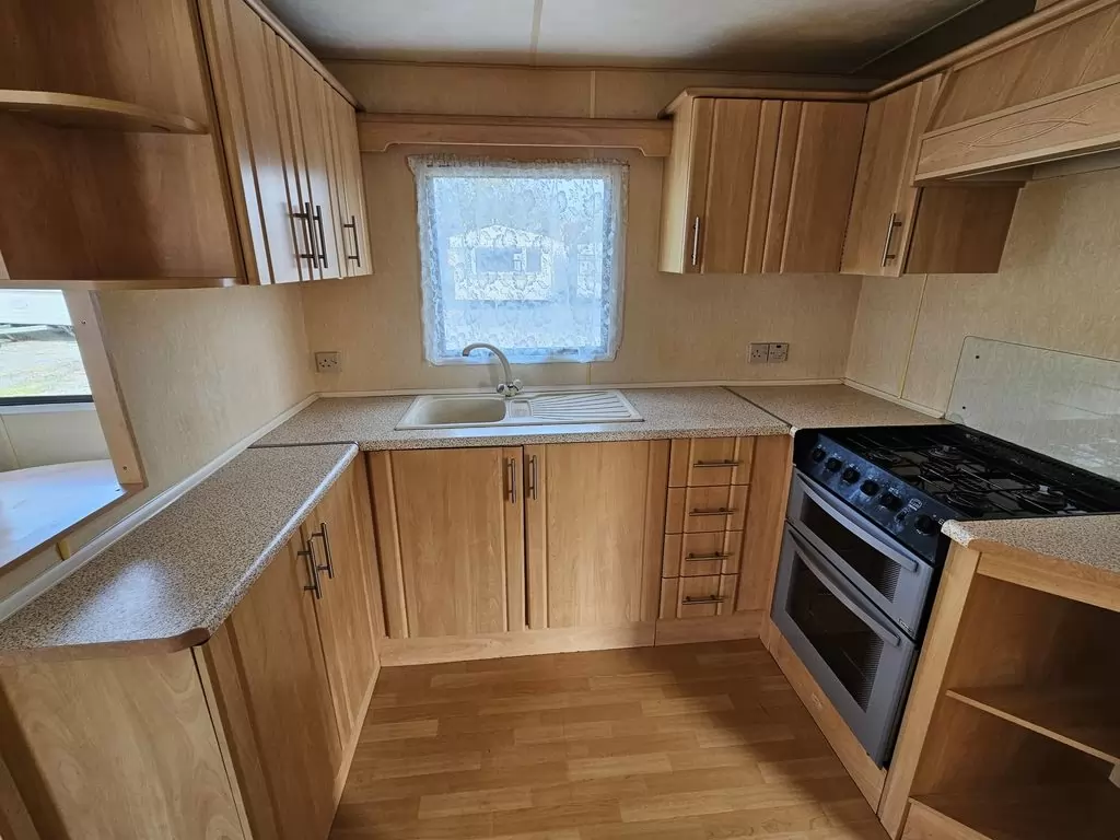 Extra široký, hezký, kompletně vybavený mobilheim 11,1 x 3,7m se dvěma vchody, SEDLOVOU STŘECHOU, DVOJITÝMI (izolačními) OKNY A DVEŘMI - dithermy. Prostorný obývací pokoj, jídelní kout, kuchyň ve tvaru U včetně spotřebičů, ložnice ( dvoulůžko ), pokoj ( 2 lůžka ), pokoj ( 2 lůžka ), koupelna se sprchovým koutem s pevnou zástěnou + wc. Plynový krb + el. přímotopy v pokojích, plynová karma na ohřev vody. Zvýšený strop v celém mobilheimu ! Mobilheim je po kuřákovi.
