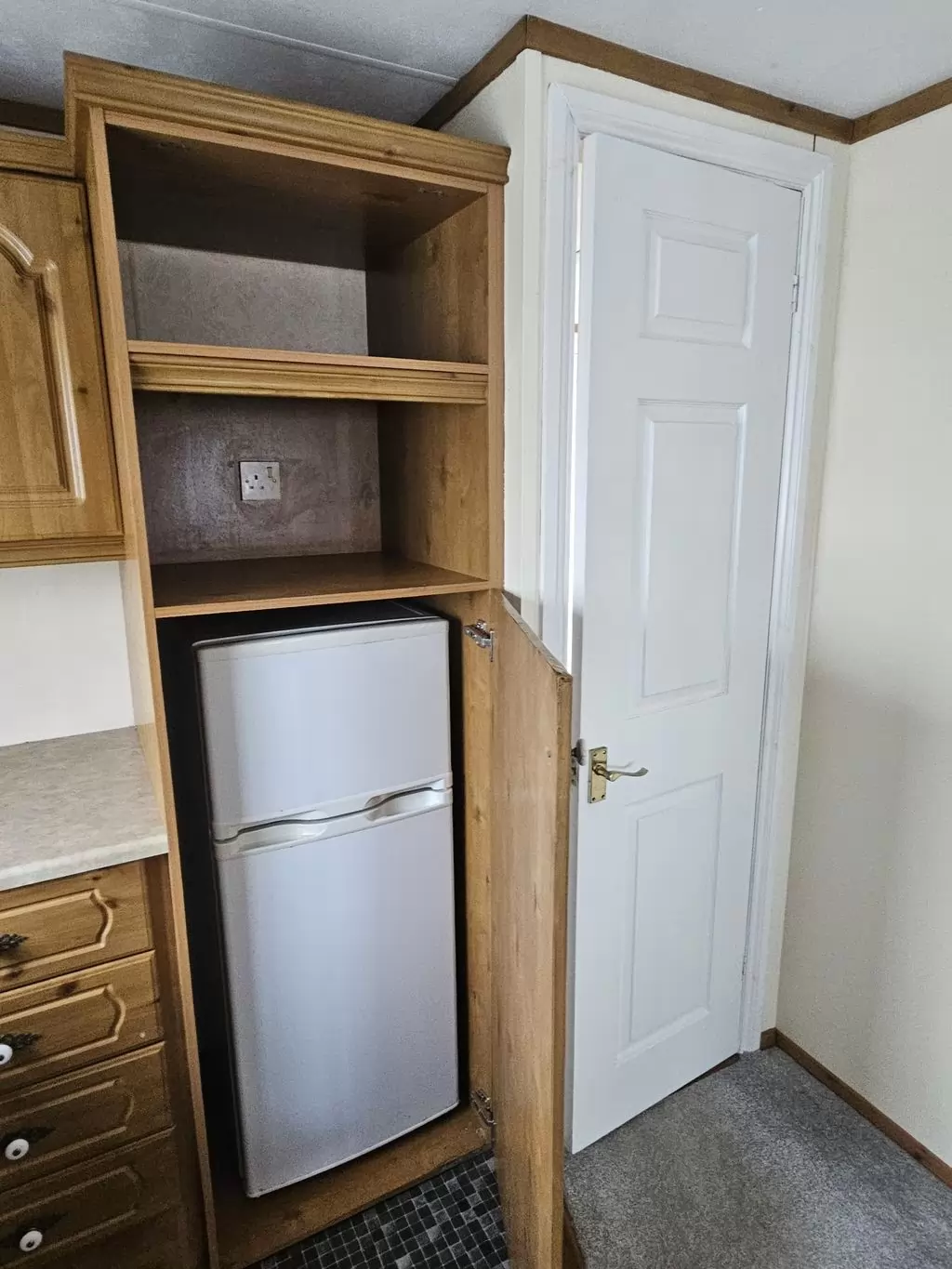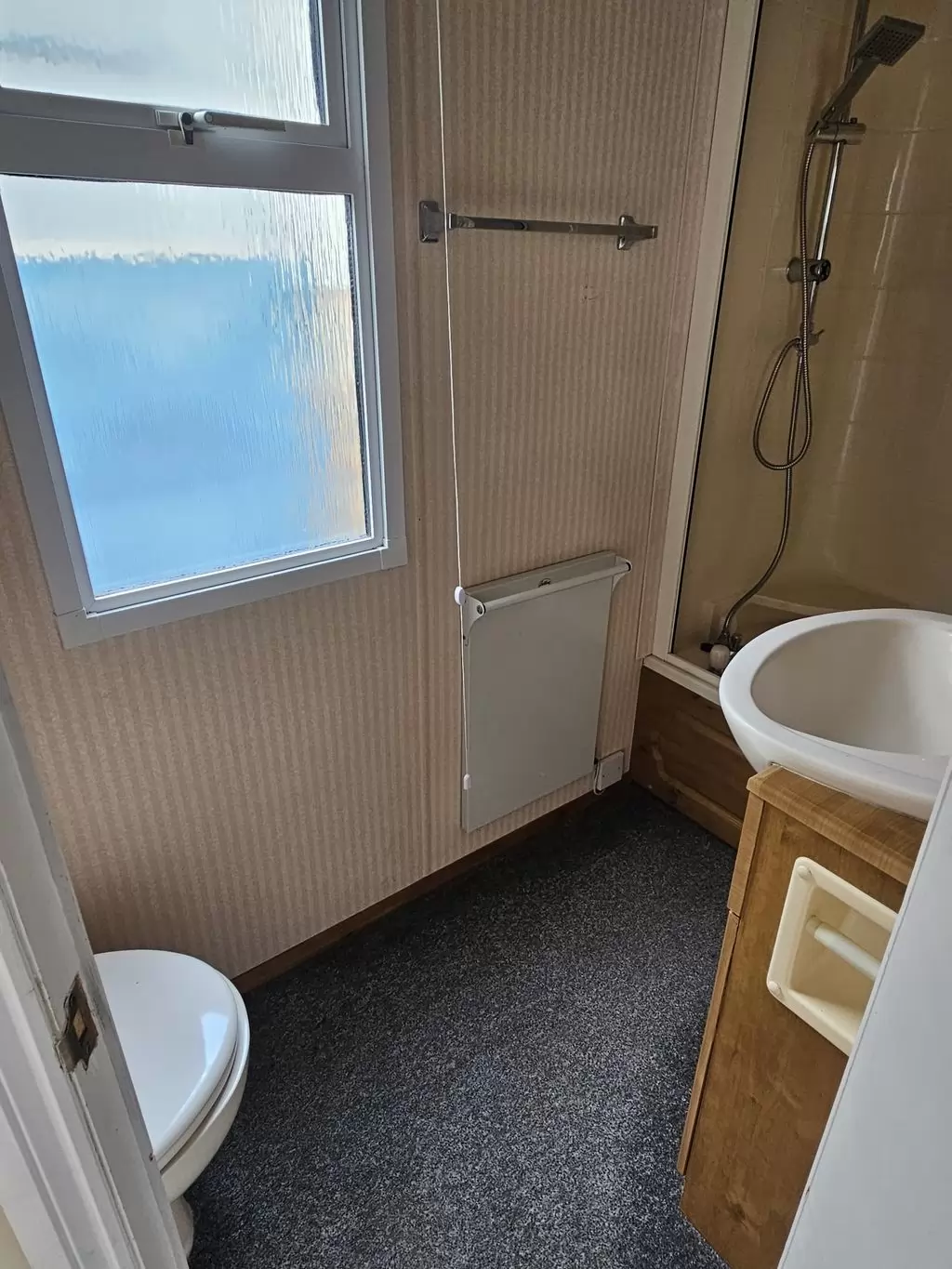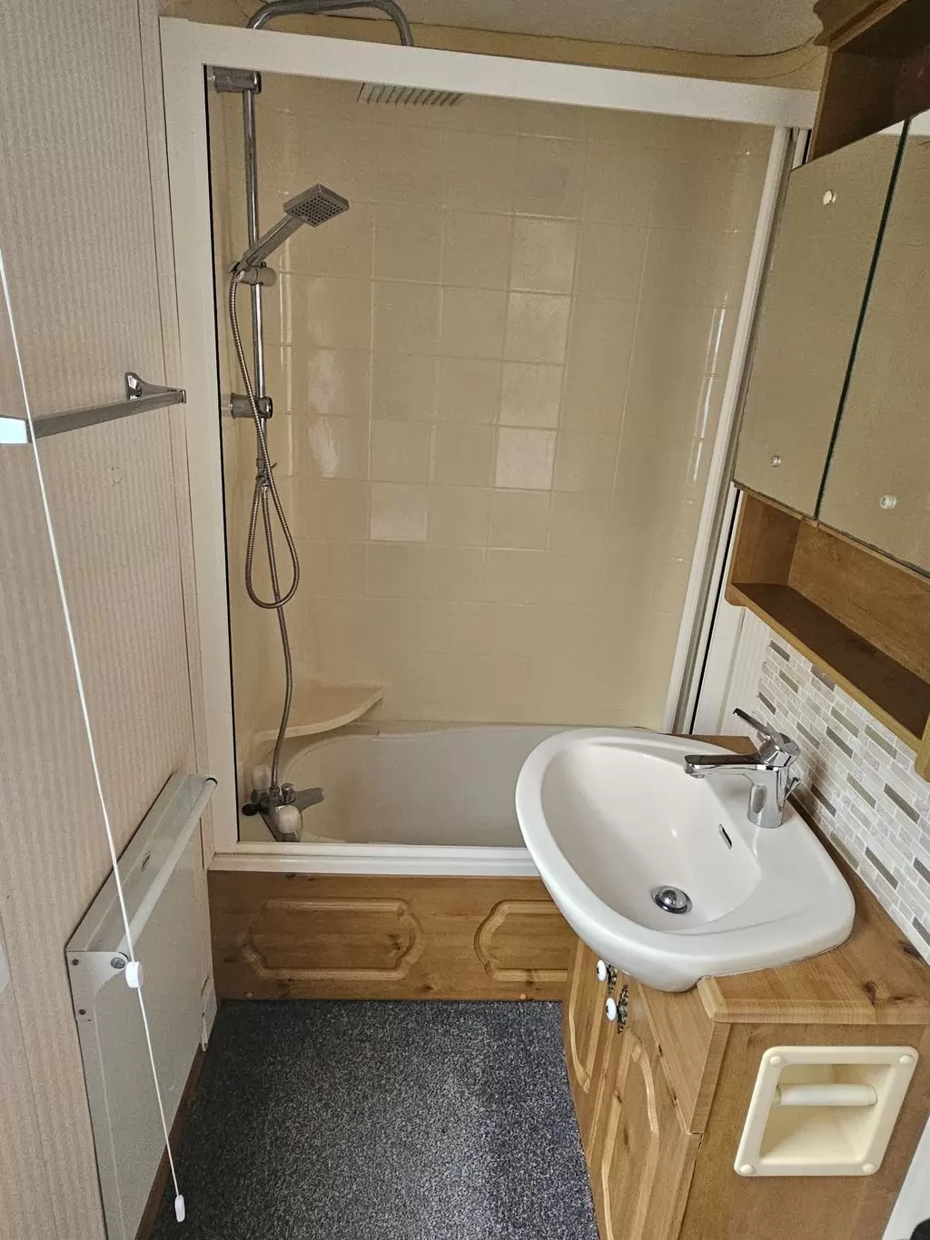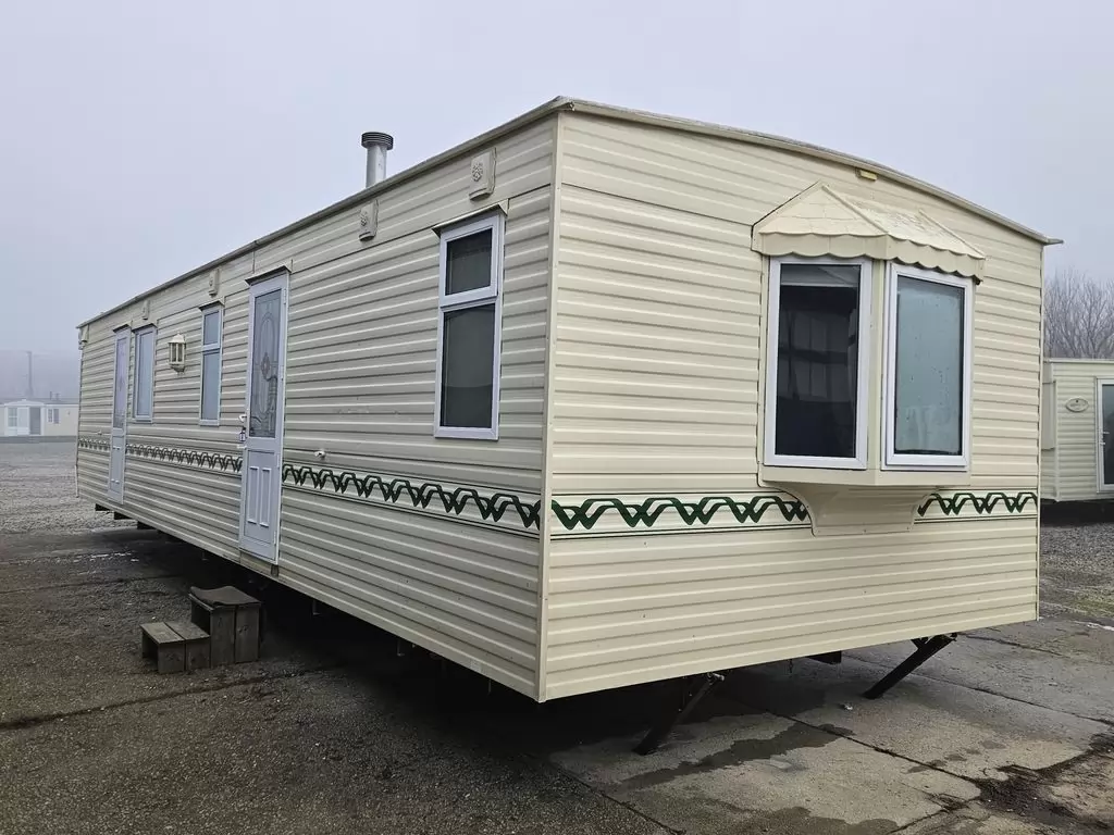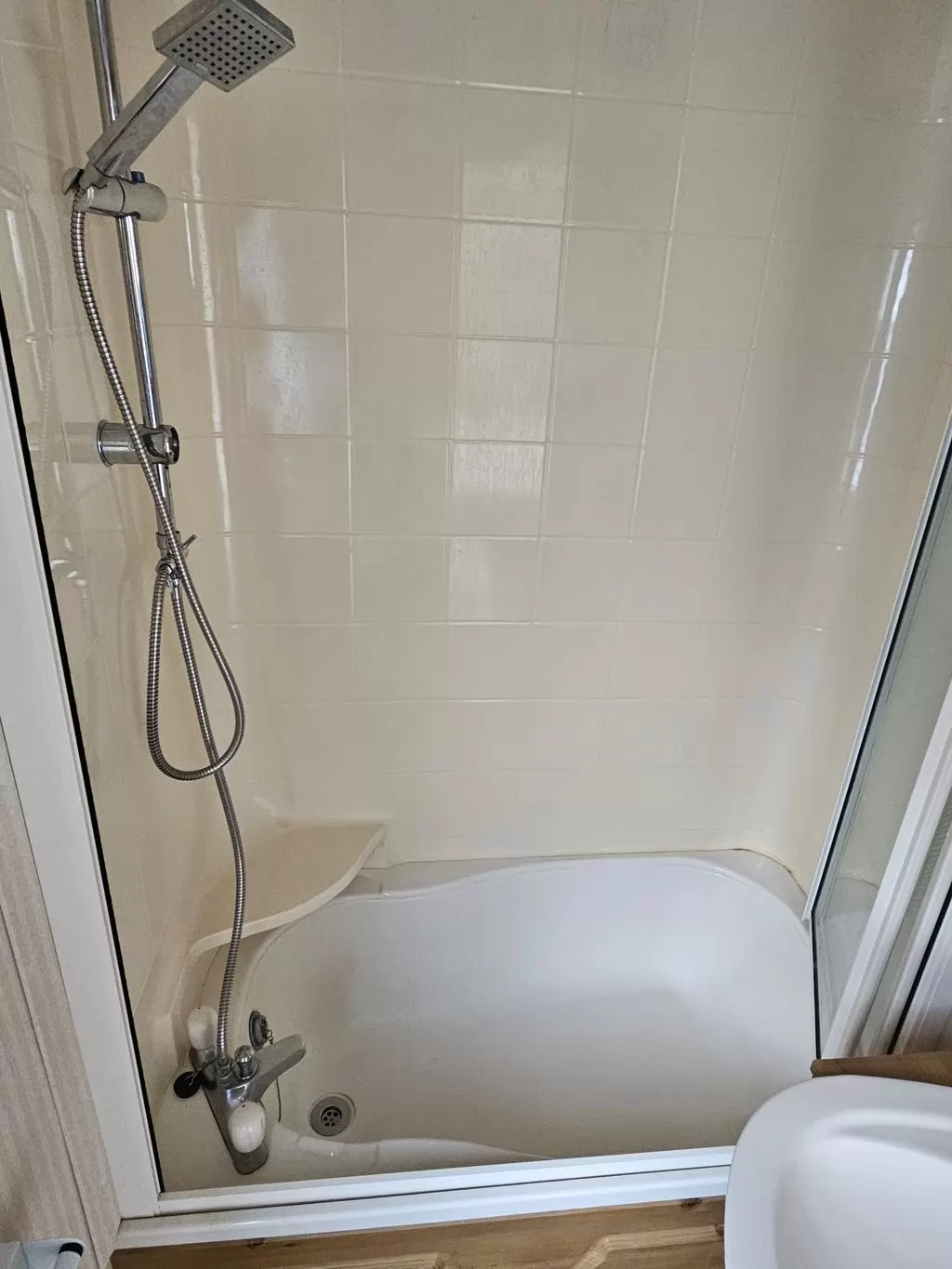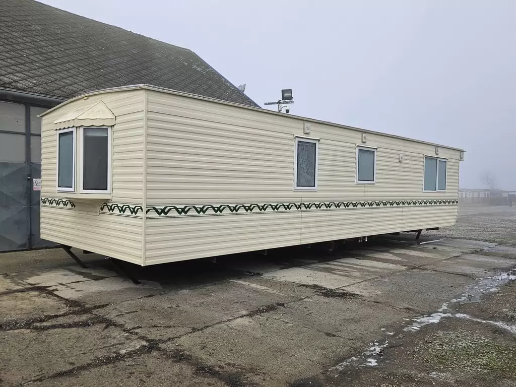 Extra široký, krásný, kompletně vybavený mobilheim 11,5 x 3,7m se dvěma vchody, DVOJITÝMI (izolačními) OKNY A DVEŘMI - dithermy. Prostorný obývací pokoj ( rozkládací sedačka ), jídelní kout, kuchyň ve tvaru U včetně spotřebičů, ložnice ( dvoulůžko ) + wc s umyvadlem, pokoj ( 2 lůžka ), koupelna se sprchovým koutem s pevnou zástěnou a sedací vaničkou + wc. Plynový krb + el. přímotop, plynová karma na ohřev vody. Zvýšený strop v celém mobilheimu !!