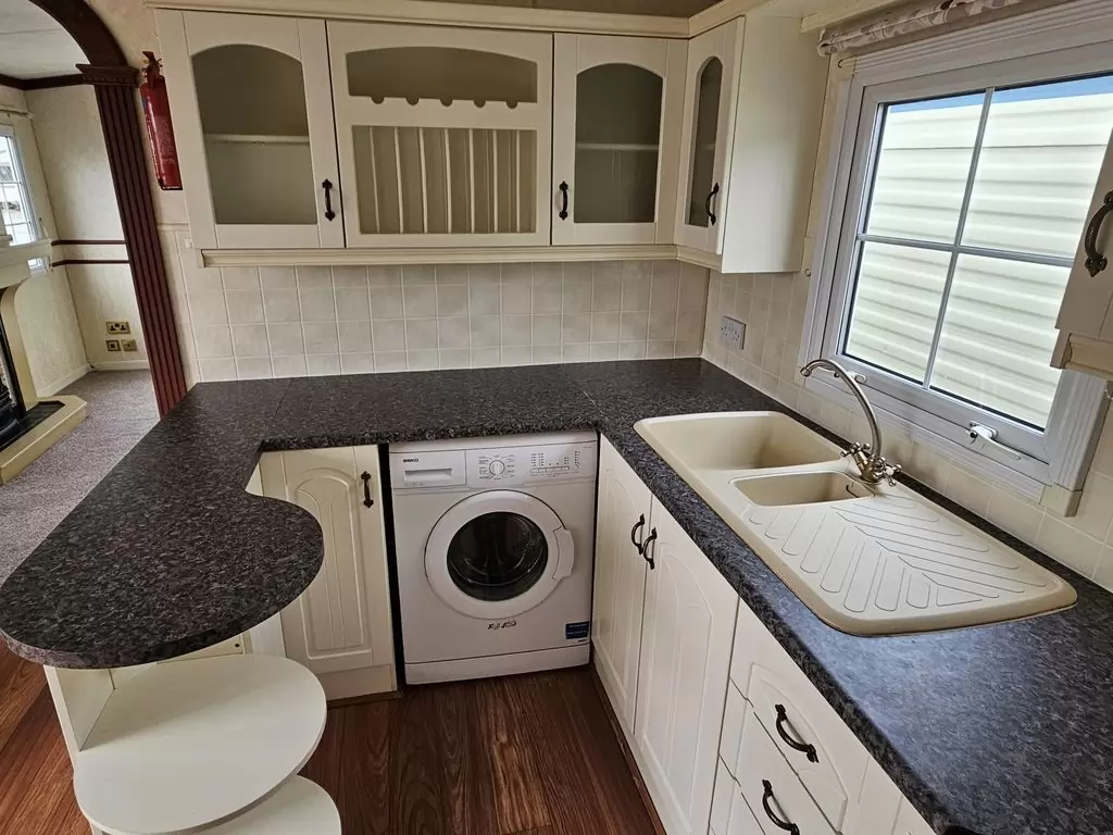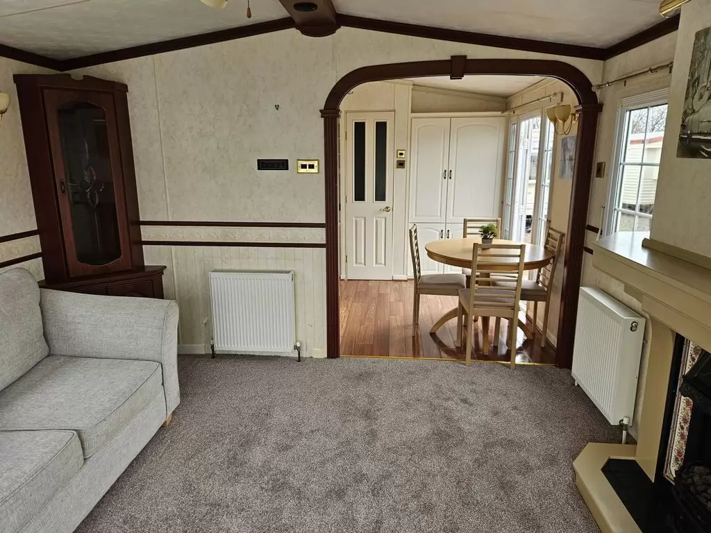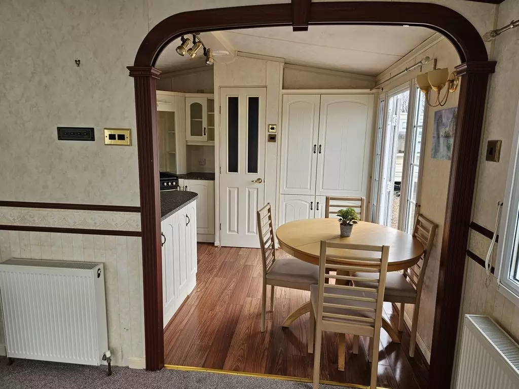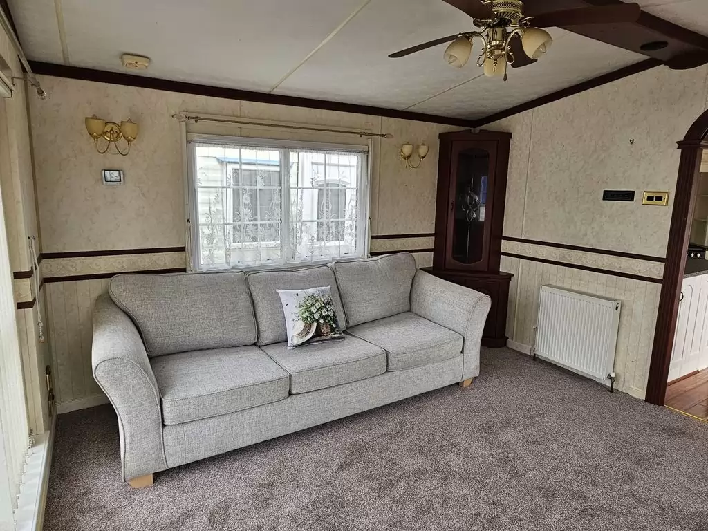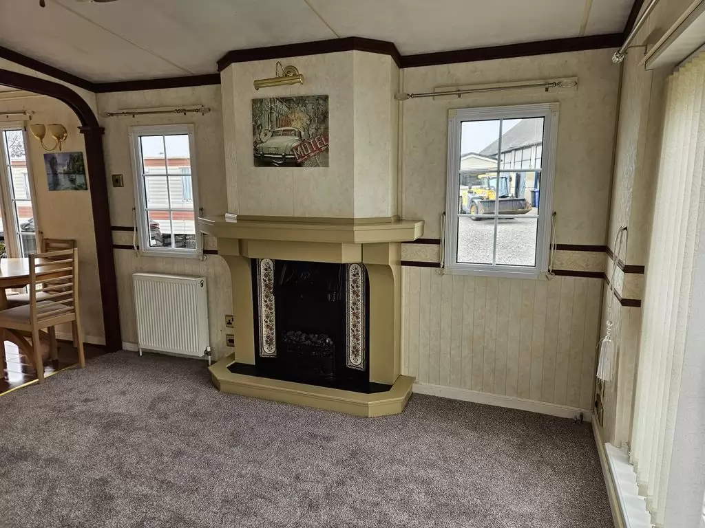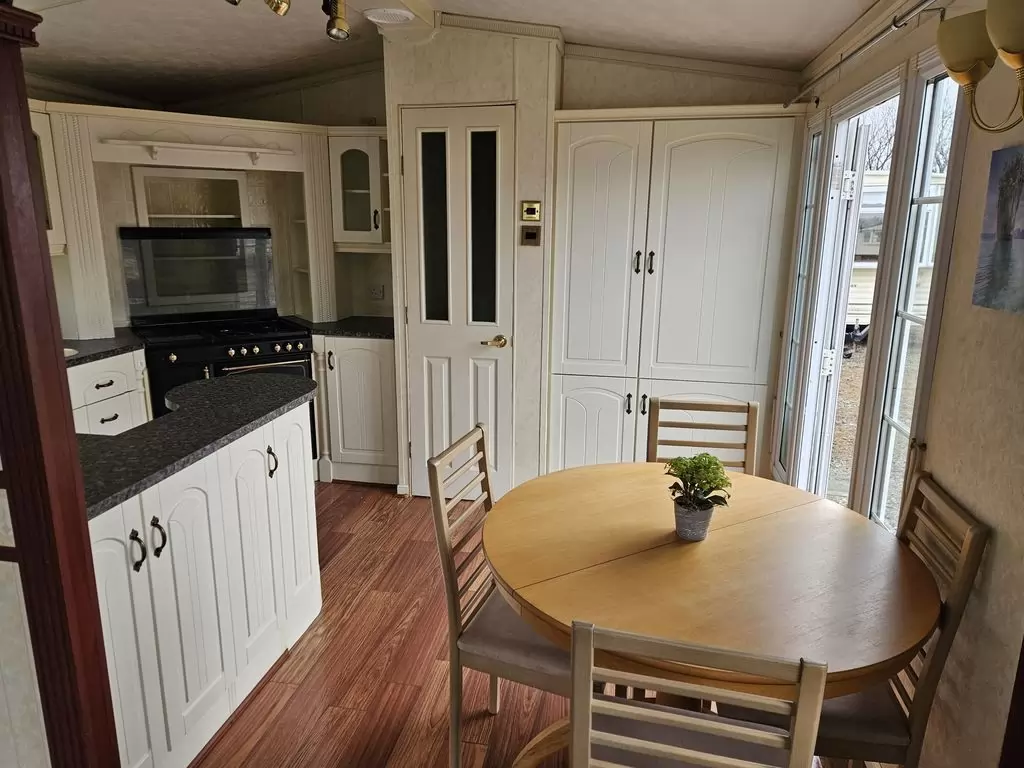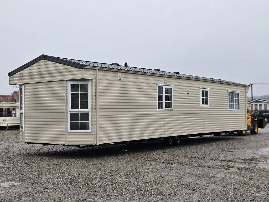 Extra široký, NÁDHERNÝ, čistý, kompletně vybavený mobilheim 12,5 x 3,7m s jedním vchodem s arkýřem, SEDLOVOU STŘECHOU S IMITACÍ STŘEŠNÍCH TAŠEK, DVOJITÝMI (izolačními) OKNY A DVEŘMI - dithermy s imitací okenic, CENTRÁLNÍM VYTÁPĚNÍM - plynový kotel + radiátory ve všech místnostech + elektrický krb v obývacím pokoji. Prostorný obývací pokoj ( rozkládací sedačka ), jídelní kout, kuchyň ve tvaru U včetně spotřebičů + pračka, prostorná ložnice (dvoulůžko s úložným prostorem) + vlastní wc s umyvadlem, pokoj ( 2 lůžka ), koupelna se sprchovým koutem s pevnou zástěnou, sedací vaničkou a termostatickou baterií + wc. POZINKOVANÝ RÁM !! Zvýšený strop v celém mobilheimu !!