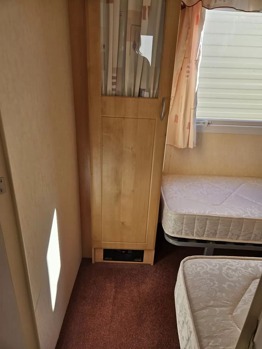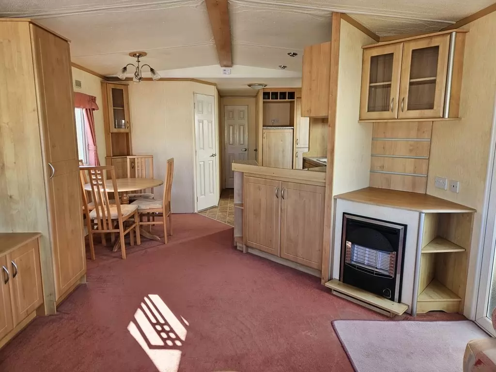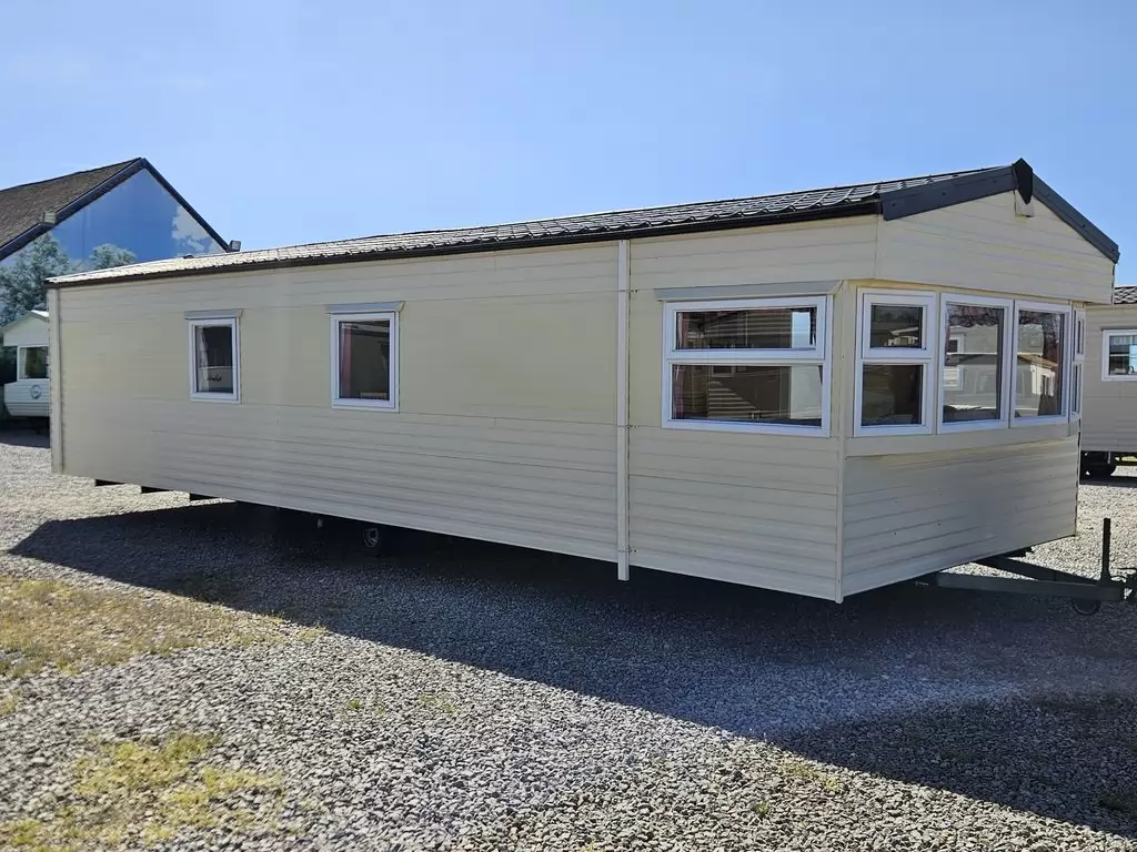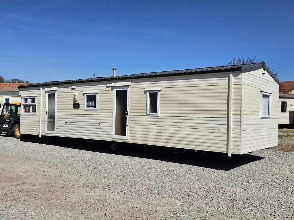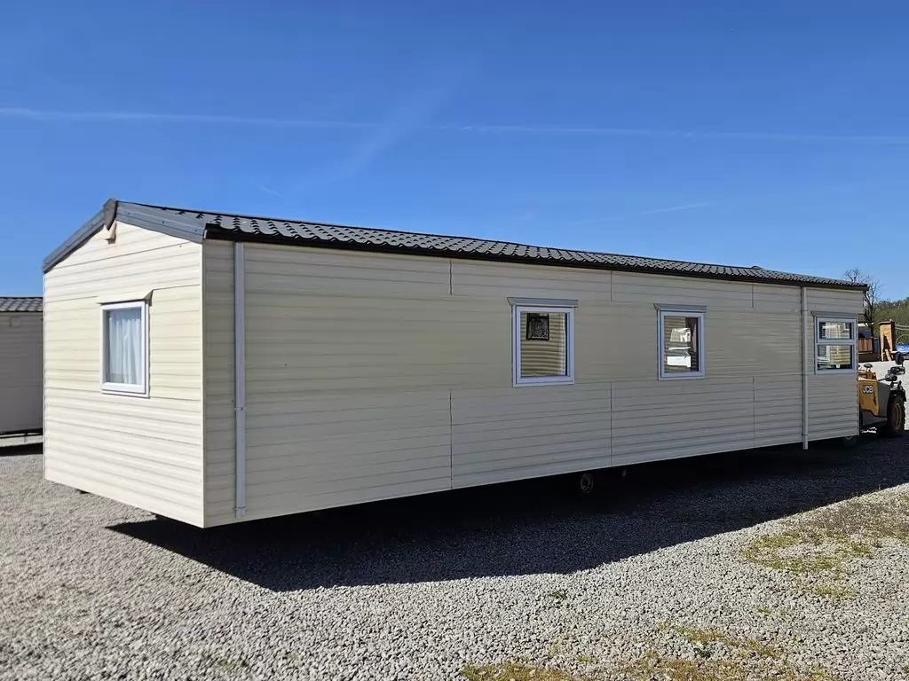Extra široký, krásný, čistý, kompletně vybavený mobilheim 11 x 3,7m se dvěma vchody , SEDLOVOU STŘECHOU s IMITACÍ STŘEŠNÍCH TAŠEK, DVOJITÝMI (izolačními) OKNY - dithermy. Prostorný obývací pokoj ( rozkládací sedačka ), jídelní kout, kuchyň ve tvaru U včetně spotřebičů, ložnice ( dvoulůžko ) se šatnou, pokoj ( 2 lůžka ), koupelna se sprchovým koutem s pevnou zástěnou a termostatickou baterií + wc. Plynový krb + el. vytápění v pokojích, plynová karma na ohřev vody. Zvýšený strop v celém mobilheimu !! Mobilheim má pomačkanou tapetu na stropě.