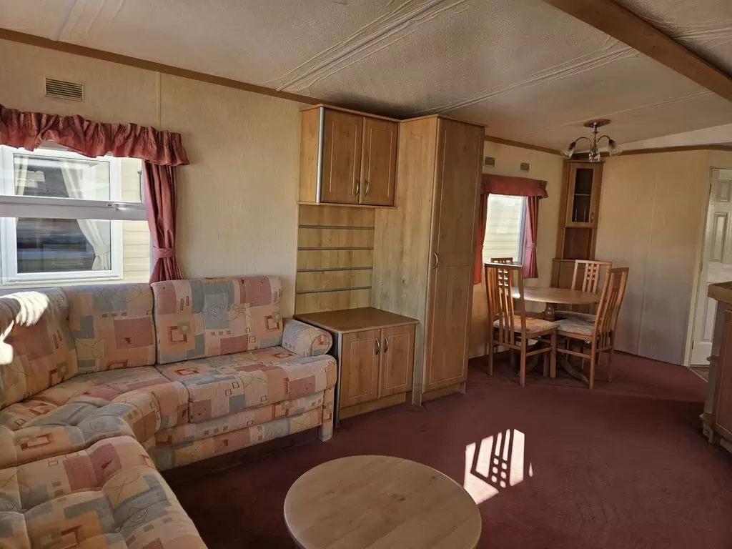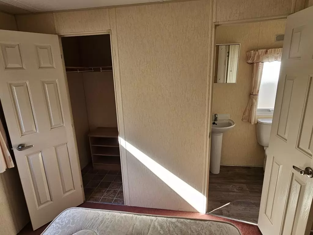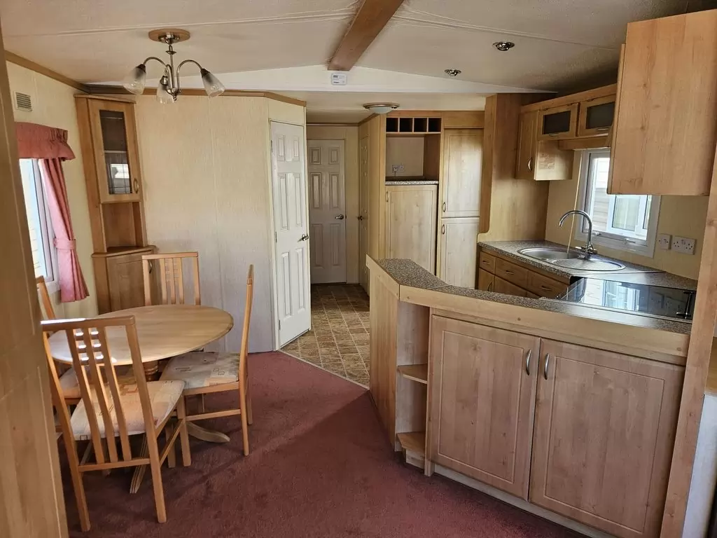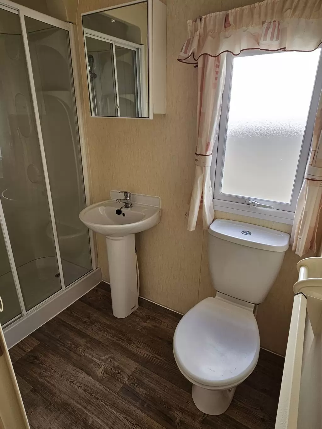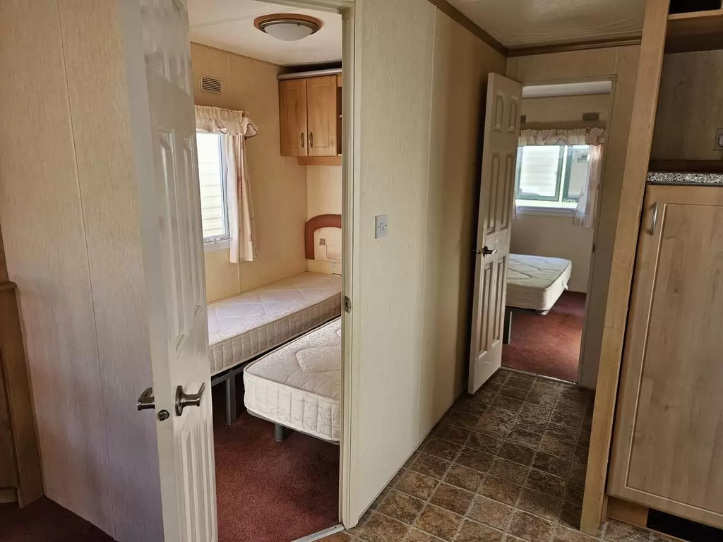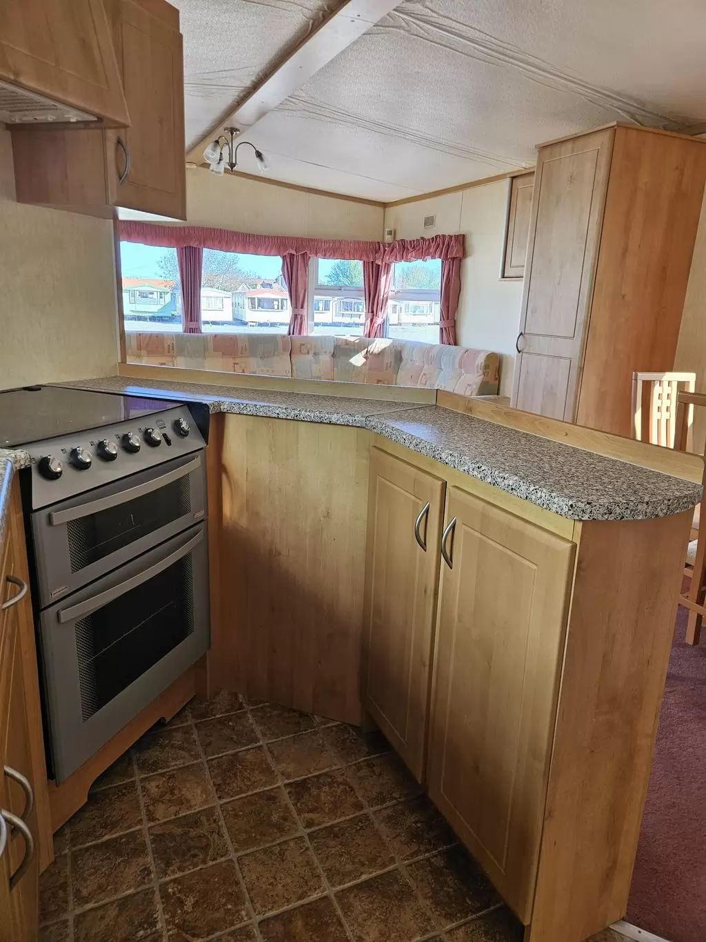 Extra široký, krásný, čistý, kompletně vybavený mobilheim 11 x 3,7m se dvěma vchody , SEDLOVOU STŘECHOU s IMITACÍ STŘEŠNÍCH TAŠEK, DVOJITÝMI (izolačními) OKNY - dithermy. Prostorný obývací pokoj ( rozkládací sedačka ), jídelní kout, kuchyň ve tvaru U včetně spotřebičů, ložnice ( dvoulůžko ) se šatnou, pokoj ( 2 lůžka ), koupelna se sprchovým koutem s pevnou zástěnou a termostatickou baterií + wc. Plynový krb + el. vytápění v pokojích, plynová karma na ohřev vody. Zvýšený strop v celém mobilheimu !! Mobilheim má pomačkanou tapetu na stropě.