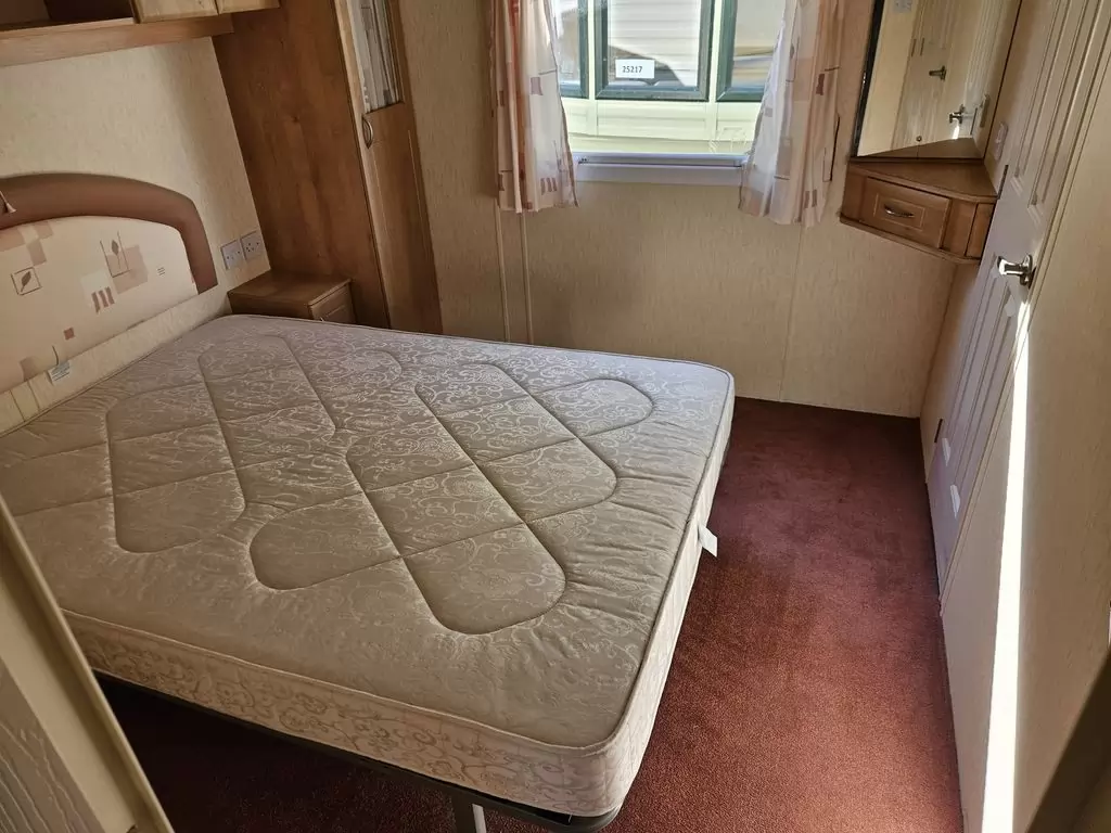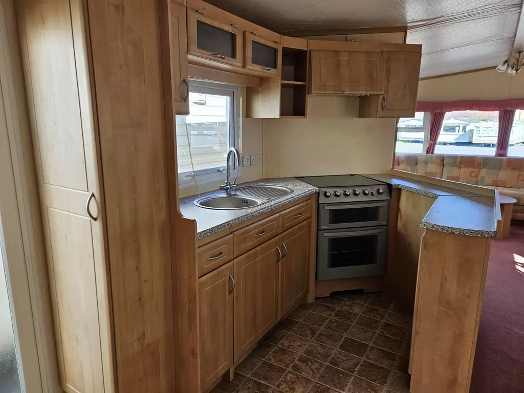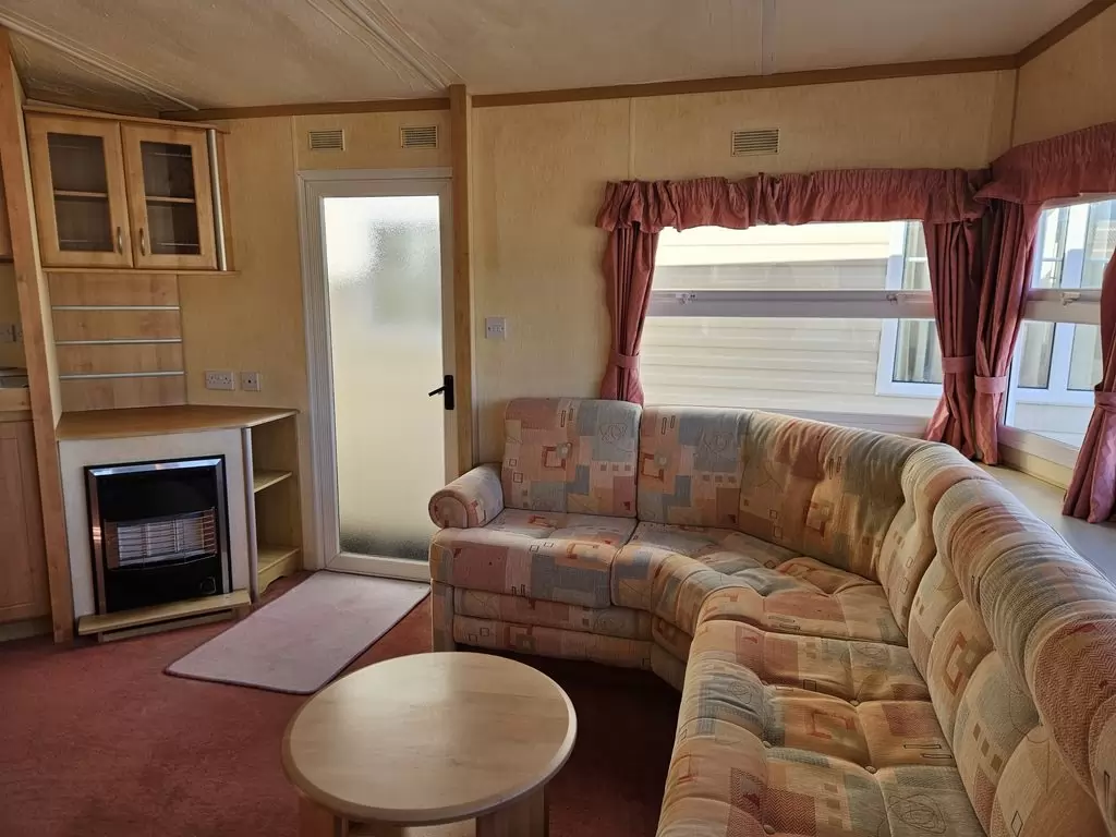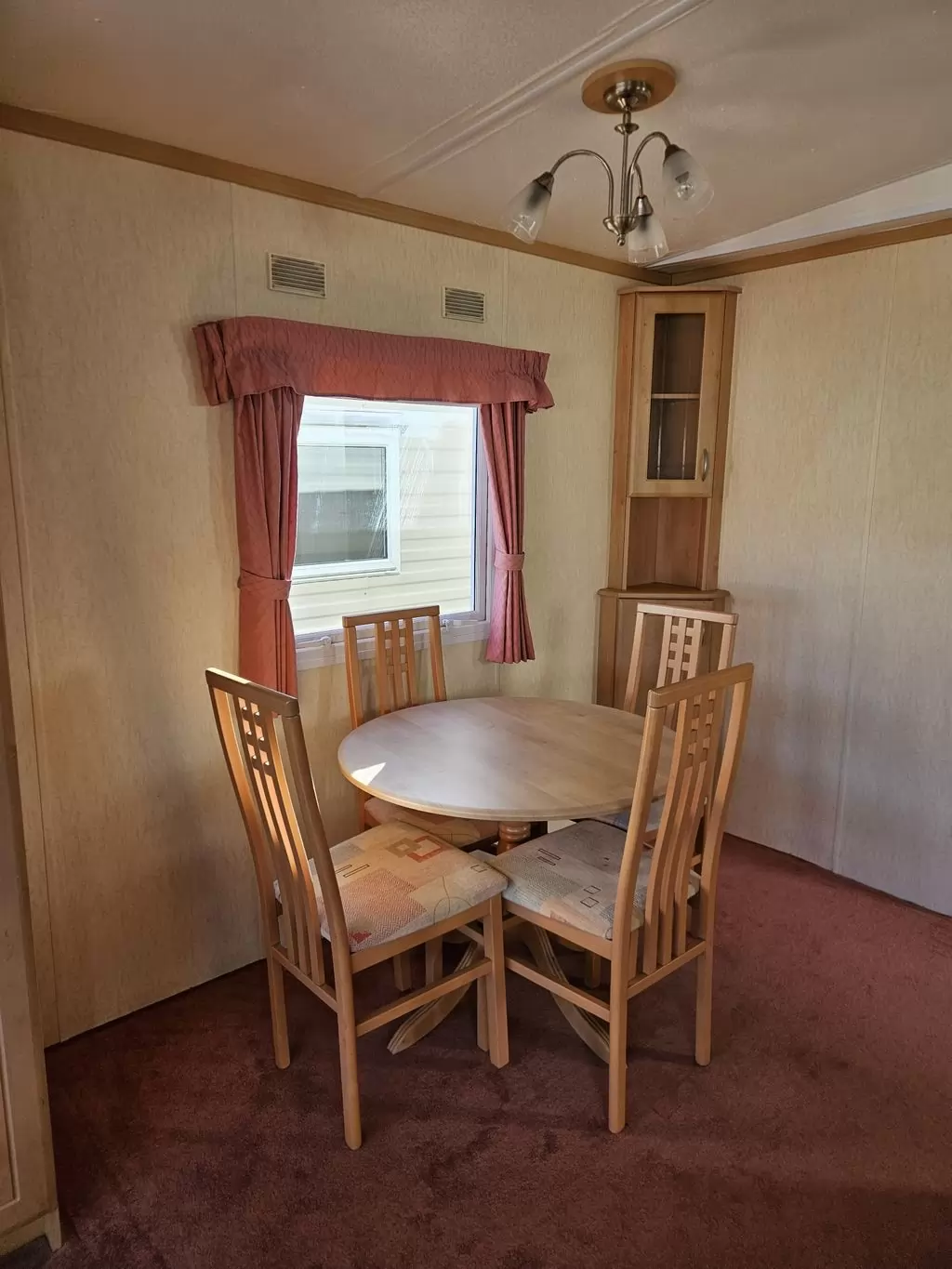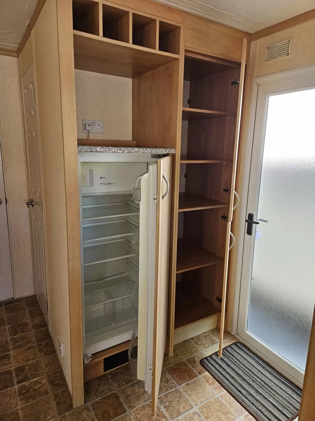 Extra široký, krásný, čistý, kompletně vybavený mobilheim 11 x 3,7m se dvěma vchody , SEDLOVOU STŘECHOU s IMITACÍ STŘEŠNÍCH TAŠEK, DVOJITÝMI (izolačními) OKNY - dithermy. Prostorný obývací pokoj ( rozkládací sedačka ), jídelní kout, kuchyň ve tvaru U včetně spotřebičů, ložnice ( dvoulůžko ) se šatnou, pokoj ( 2 lůžka ), koupelna se sprchovým koutem s pevnou zástěnou a termostatickou baterií + wc. Plynový krb + el. vytápění v pokojích, plynová karma na ohřev vody. Zvýšený strop v celém mobilheimu !! Mobilheim má pomačkanou tapetu na stropě.