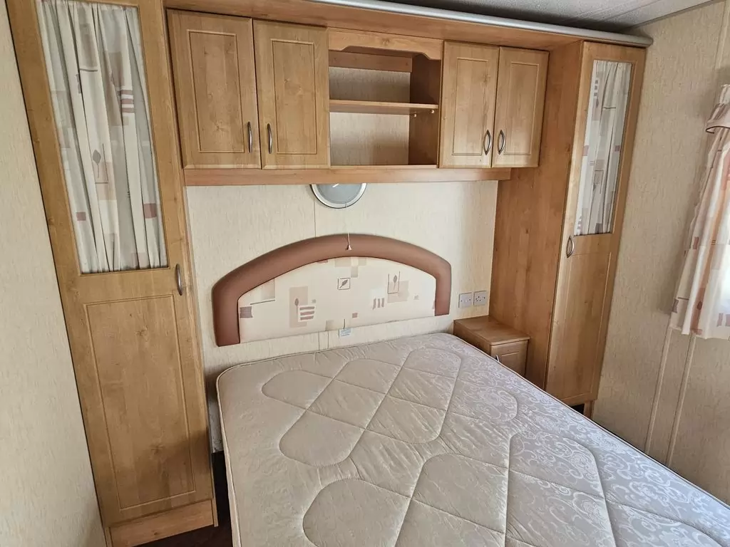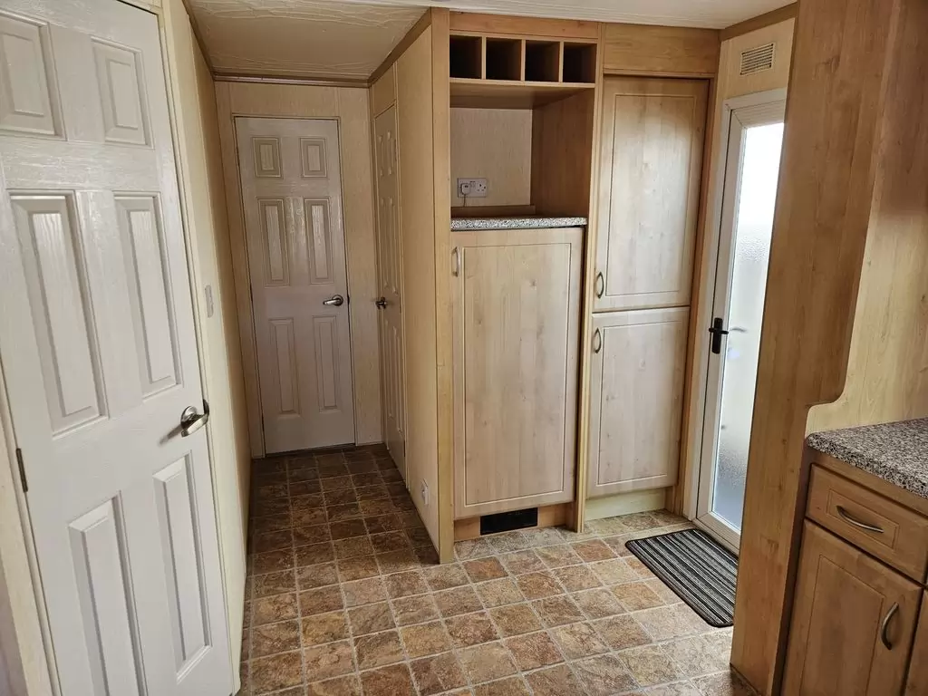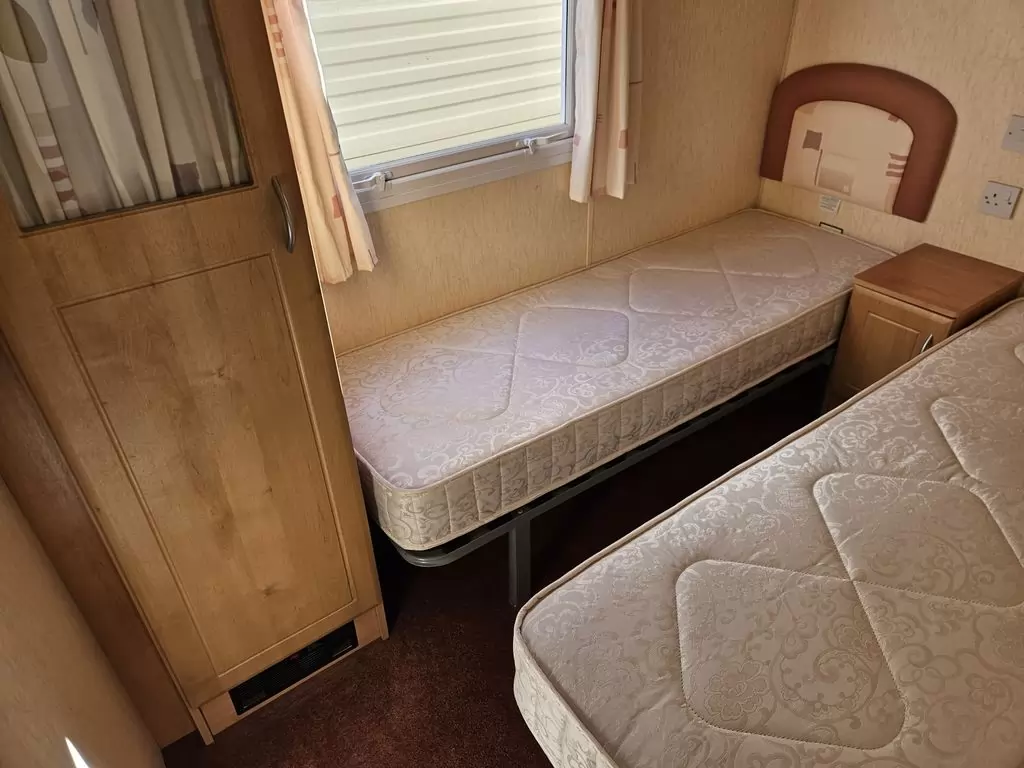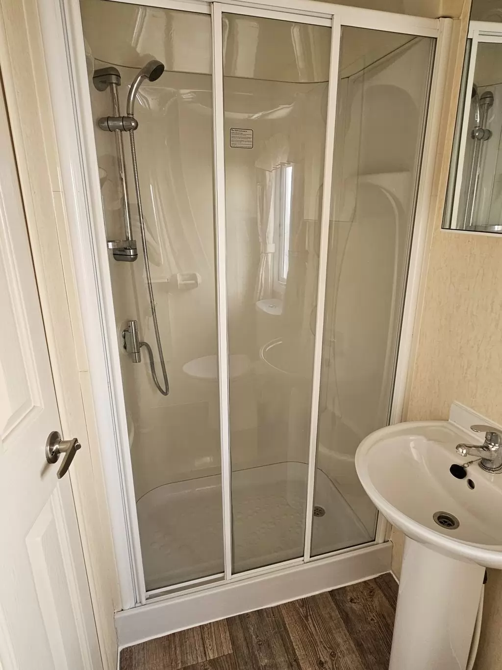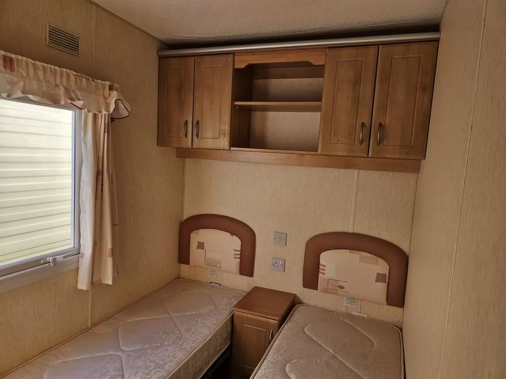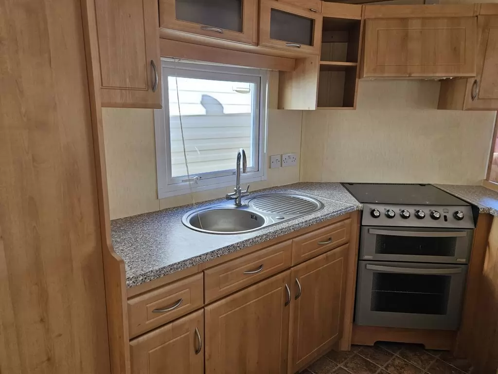 Extra široký, krásný, čistý, kompletně vybavený mobilheim 11 x 3,7m se dvěma vchody , SEDLOVOU STŘECHOU s IMITACÍ STŘEŠNÍCH TAŠEK, DVOJITÝMI (izolačními) OKNY - dithermy. Prostorný obývací pokoj ( rozkládací sedačka ), jídelní kout, kuchyň ve tvaru U včetně spotřebičů, ložnice ( dvoulůžko ) se šatnou, pokoj ( 2 lůžka ), koupelna se sprchovým koutem s pevnou zástěnou a termostatickou baterií + wc. Plynový krb + el. vytápění v pokojích, plynová karma na ohřev vody. Zvýšený strop v celém mobilheimu !! Mobilheim má pomačkanou tapetu na stropě.